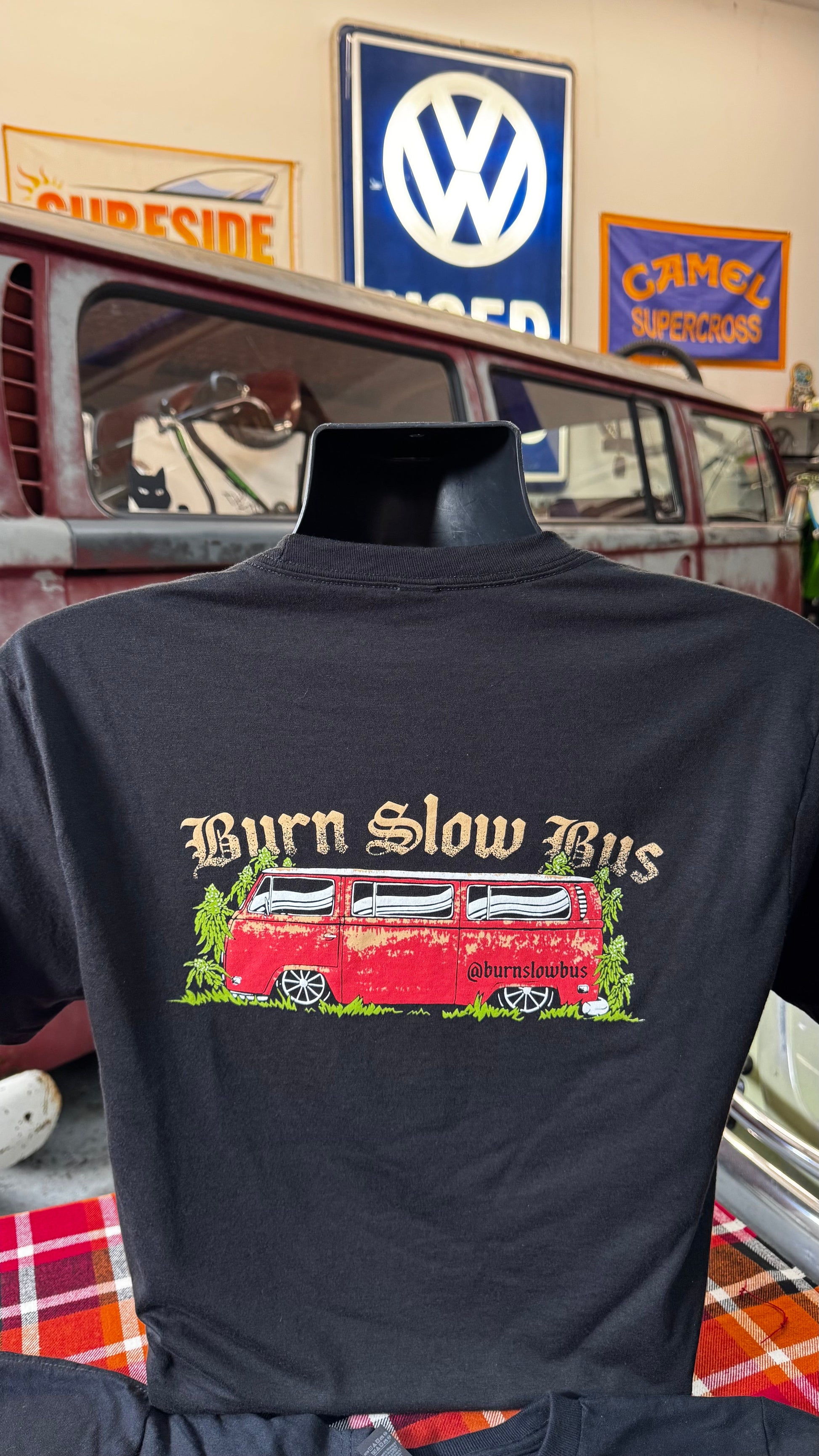 Rockin the Olde English Burn Slow Bus font across the front and the “In the Weeds” side profile graphic on the back